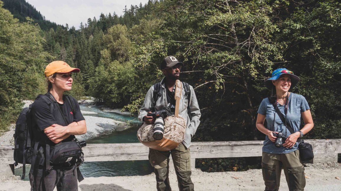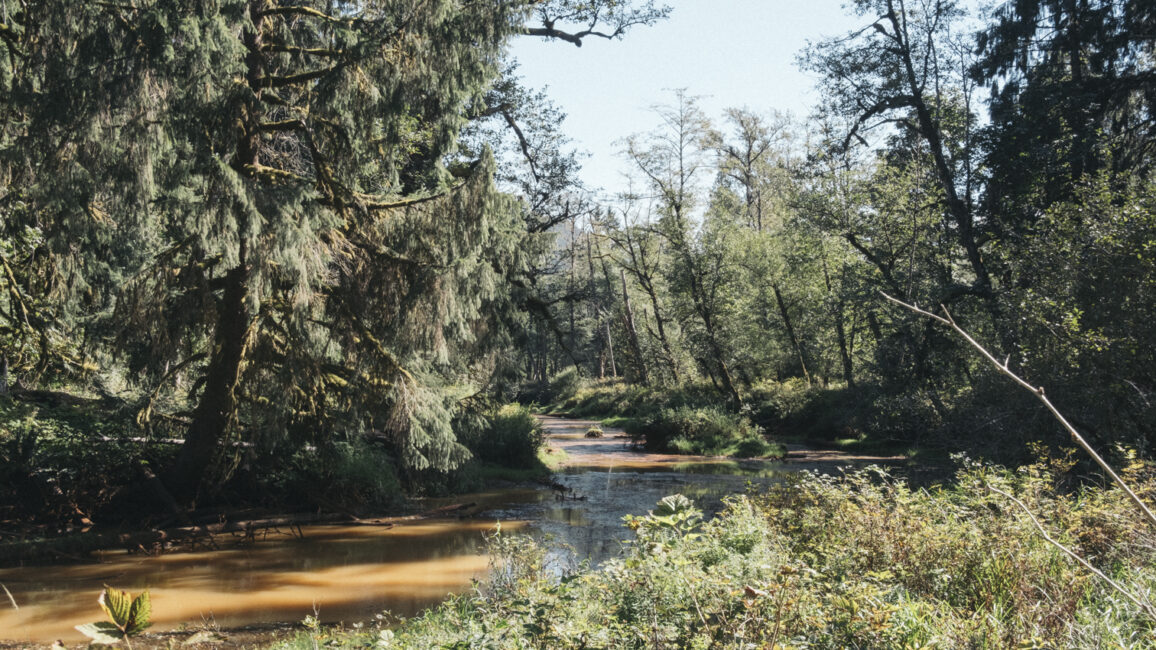 Au cours de leur visite, ils ont exploré le Red Slough, une rivière peu profonde caractérisée par des eaux et des berges rouges attribuables à de fortes concentrations de fer. Les chercheurs et les écologistes travaillant dans la région estiment que la construction d’une route principale en réponse à l’intensification de l’exploitation forestière dans la région dans les années 1950 a coupé le Red Slough de sa source, la rivière Pitt. La réduction du débit de l’eau a entraîné une baisse des niveaux d’oxygène, entraînant l’accumulation de dépôts de fer et donnant à l’eau une couleur rouge foncé, d’où le nom de « Red Slough » (marécage rouge). Cette perturbation a entraîné la mort des saumons qui tentaient d’y frayer et a fait perdre au canal sa capacité à servir d’habitat sain pour la faune et la flore.
